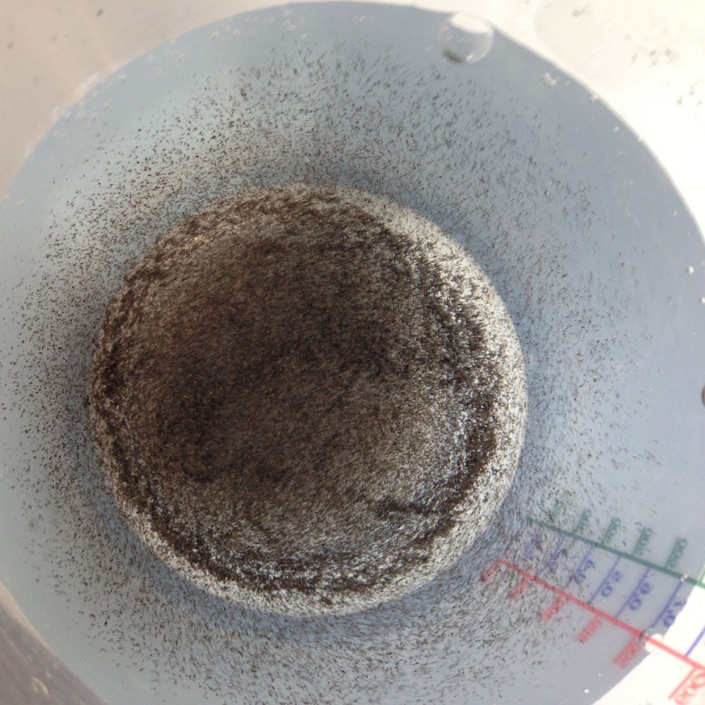Optimal dafür ist ein Set an Bodensieben. Ich nutze die folgenden Siebe, um die Probe damit in etwa gleichgroße Portionen aufzutrennen: 800 µm, 425 µm, 250 µm, 150 µm, 100 µm. Das gröbste Sieb ist oben und das feinste unten, so dass sich die Partikel beim Schütteln ihrer Größe nach zwischen den verschiedenen Sieben zu insg. sechs Korngrößenklassen sortieren. Durch den Auffangboden und den Deckel kann man damit recht staubfrei arbeiten. Allerdings sind diese Siebe sehr teuer. Man kann hier auch auf Haushaltssiebe unterschiedlicher Maschenweiten zurückgreifen, beispielsweise haben Mehlsiebe enger Maschenweiten als andere Haushaltssiebe. Auch eine Trennung in zwei oder drei Fraktionen ist schon hilfreich.