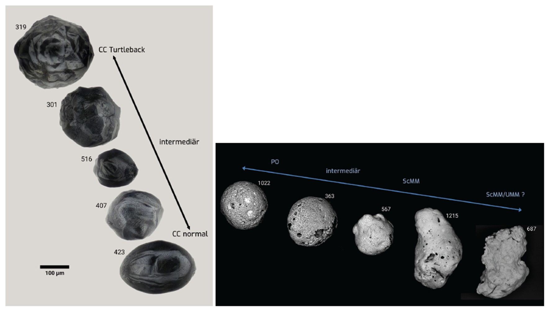 Besondere Merkmale sind durch Pfeile hervorgehoben. In der Regel sind die kosmischen und ähnliche terrestrische Partikel zum Vergleich gegenübergestellt. Auf den Ebenen 1 und 2 werden sichere und unterstützende Erkennungsmerkmale nochmals gesondert hervorgehoben, sofern diese für den jeweiligen Typ existieren: