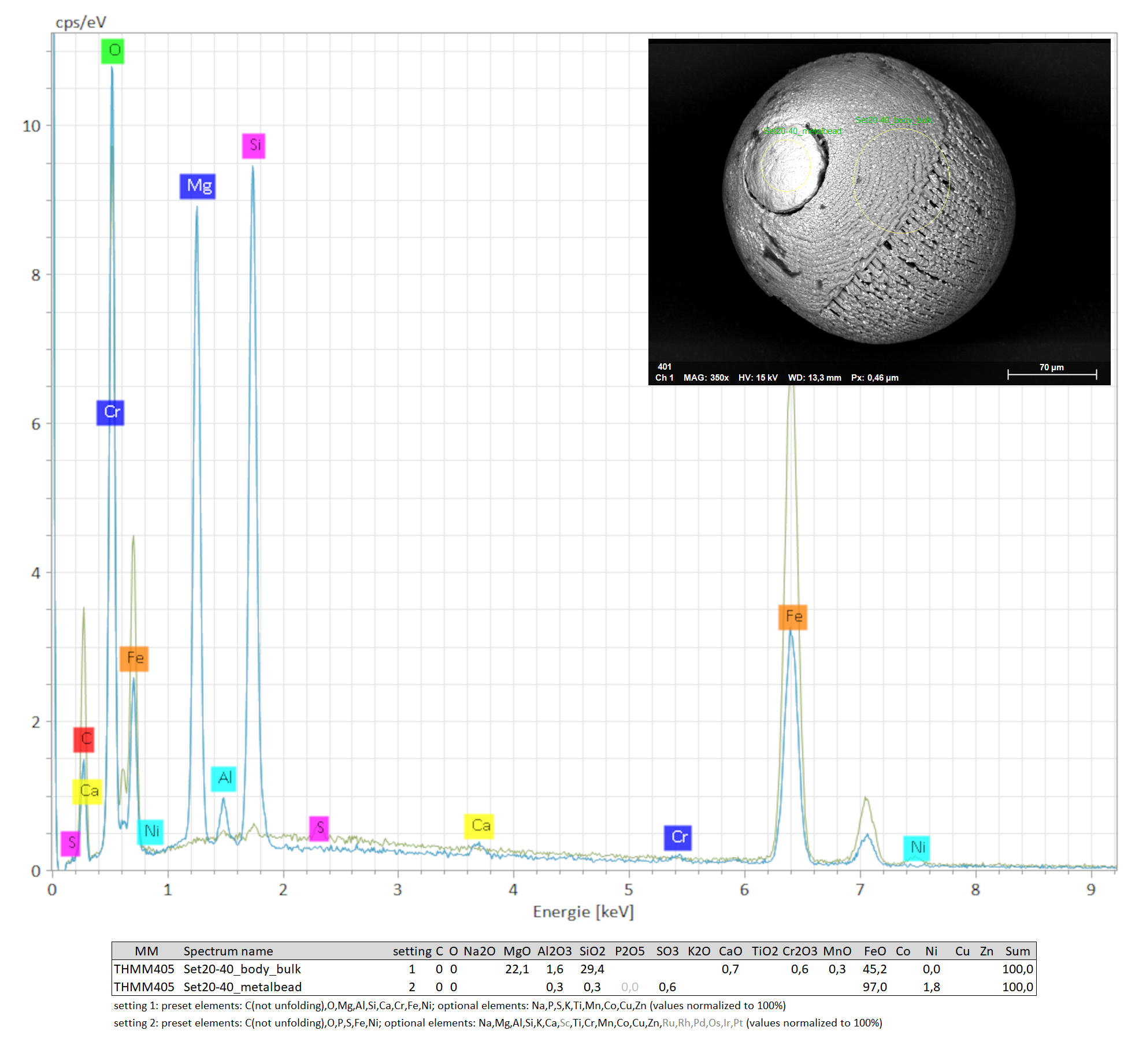 Metal differentiation: Fe/Ni bead, (Fe/Ni crust)