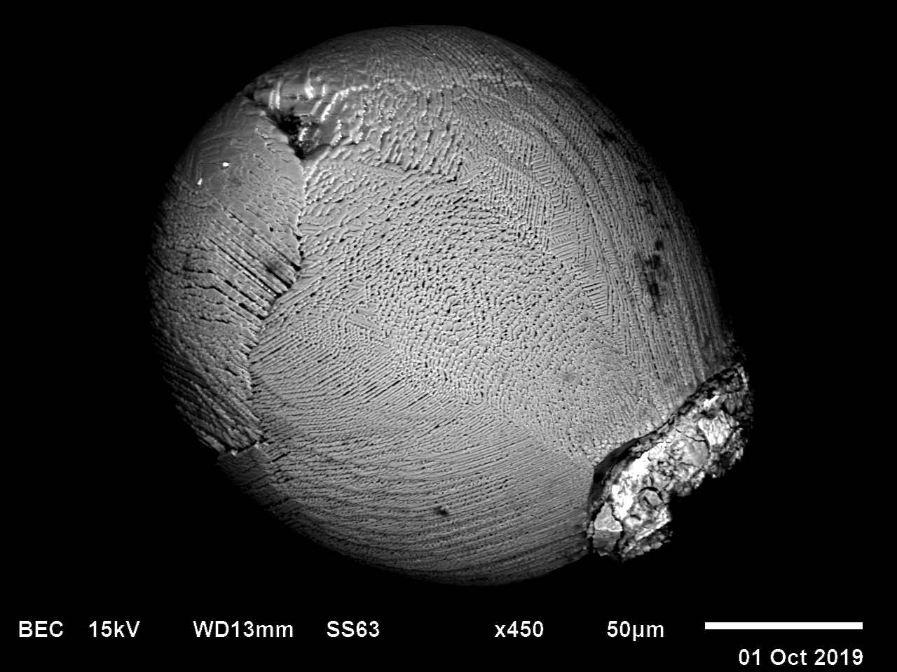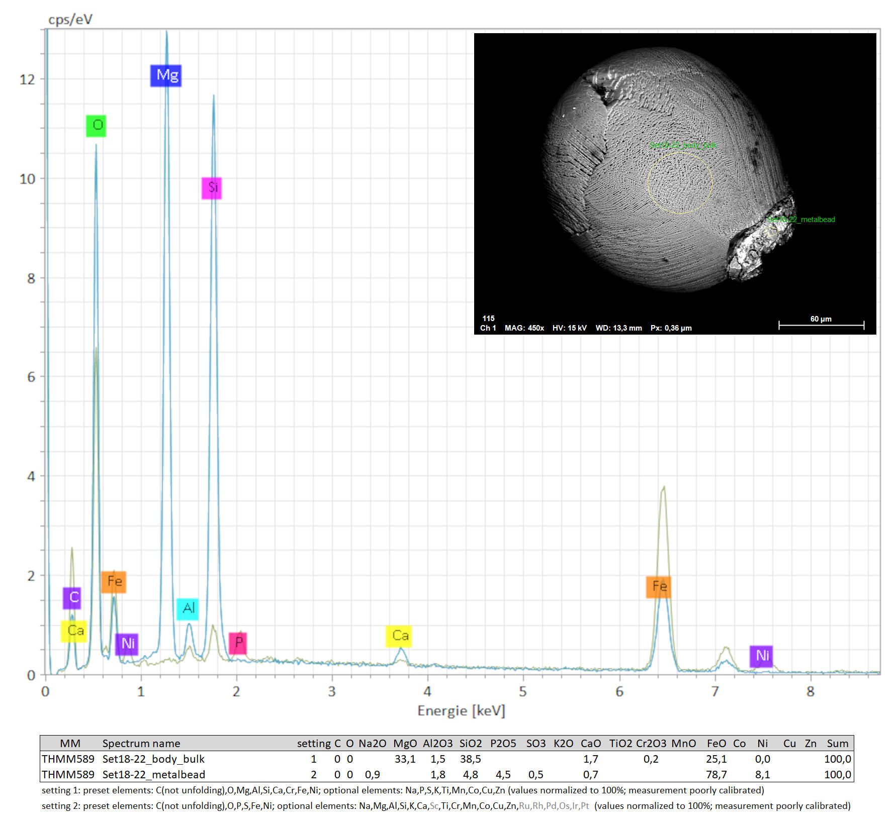 Vorheriges Produkt Nächstes Produkt THMM589 Classification: Barred Olivine (BO) Size: 170 x 195 µm | Shape: roundish | Colour: grey/black Crystalline structure: oriented crystals Metal differentiation: Fe/Ni bead Locality: site #56 | rooftop, drainage-bound deposits | N 52.670800, E 7.301100 | Terrestrial age: 0-21 a