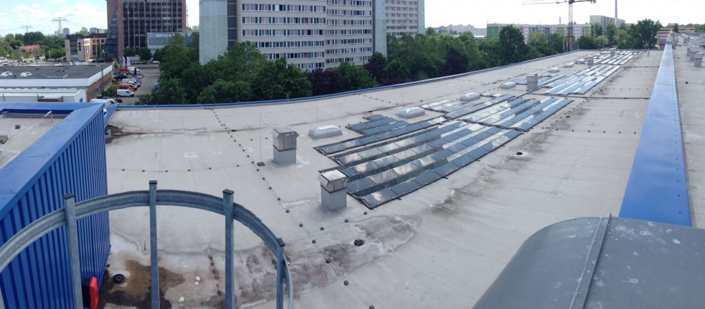 Dieser Frage nachgehend habe ich im Juni 2020 einen 3000 qm großen Dachabschnitt eines größeren Dachkomplexes gezielt auf unterschiedliche Ablagerungsregime hin beprobt. Das Dach (siehe Foto) ist 10 Jahre alt und hat 2 Entwässerungsrinnen mit mehreren inneren Abläufen. Der Dachrand ist an 3 Seiten des Daches etwa 15 cm hoch, zur einen Seiten hin grenzt das Dach an ein mehrere Meter höher gelegenes Dach getrennt durch eine deutliche Barriere.